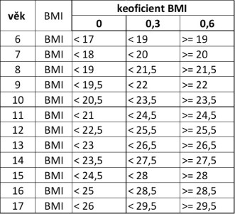 Vzorec pro výpočet bodů a BMI je podobný jako pro dospělé. Protože u dětí není hendikepem stáří nýbrž mládí, odečítá se jejich věk ve zorečku od čísla 35. Pak se liší i koeficient BMI, který je pro děti rozdílný než pro dospělé. Viz tabulka níže: